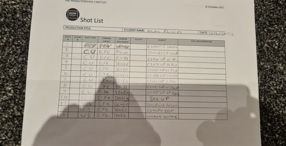 Chapter 1 - Planning & Pre-ProductionOwen PhillipsMar 2, 20221 min readUpdated: May 18, 2022Proposal:- Project Action Plan and Timetable:-Pre-ProductionStoryboard:-Script:-Script.docxDownload DOCX • 14KBShot List:-